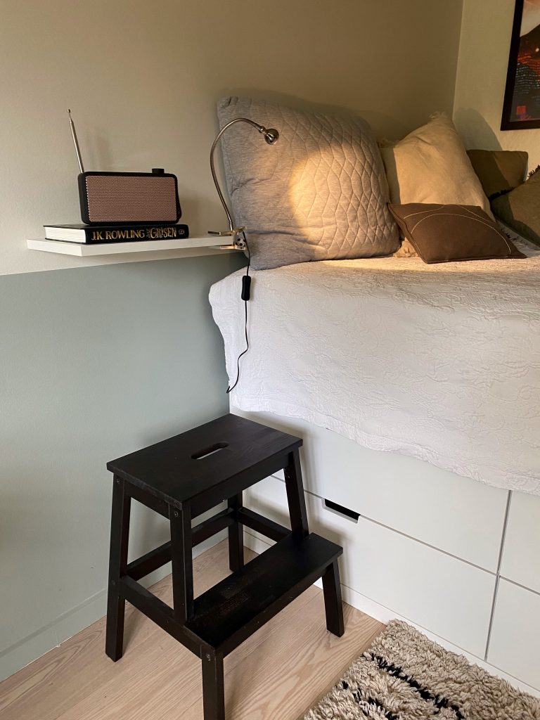 Da pladsen var begrænset, blev kreativ pladsoptimering nøglen. Derfor valgte jeg at hæve sengen for at skabe plads til skuffeelementer under sengen, ideelle til opbevaring af tøj og personlige ejendele. Ved at opdele væggene, med den grønne farve forneden og hvid øverst, har jeg skabt en illusion af større loftshøjde, hvilket åbner rummet op og giver det en luftig følelse.
